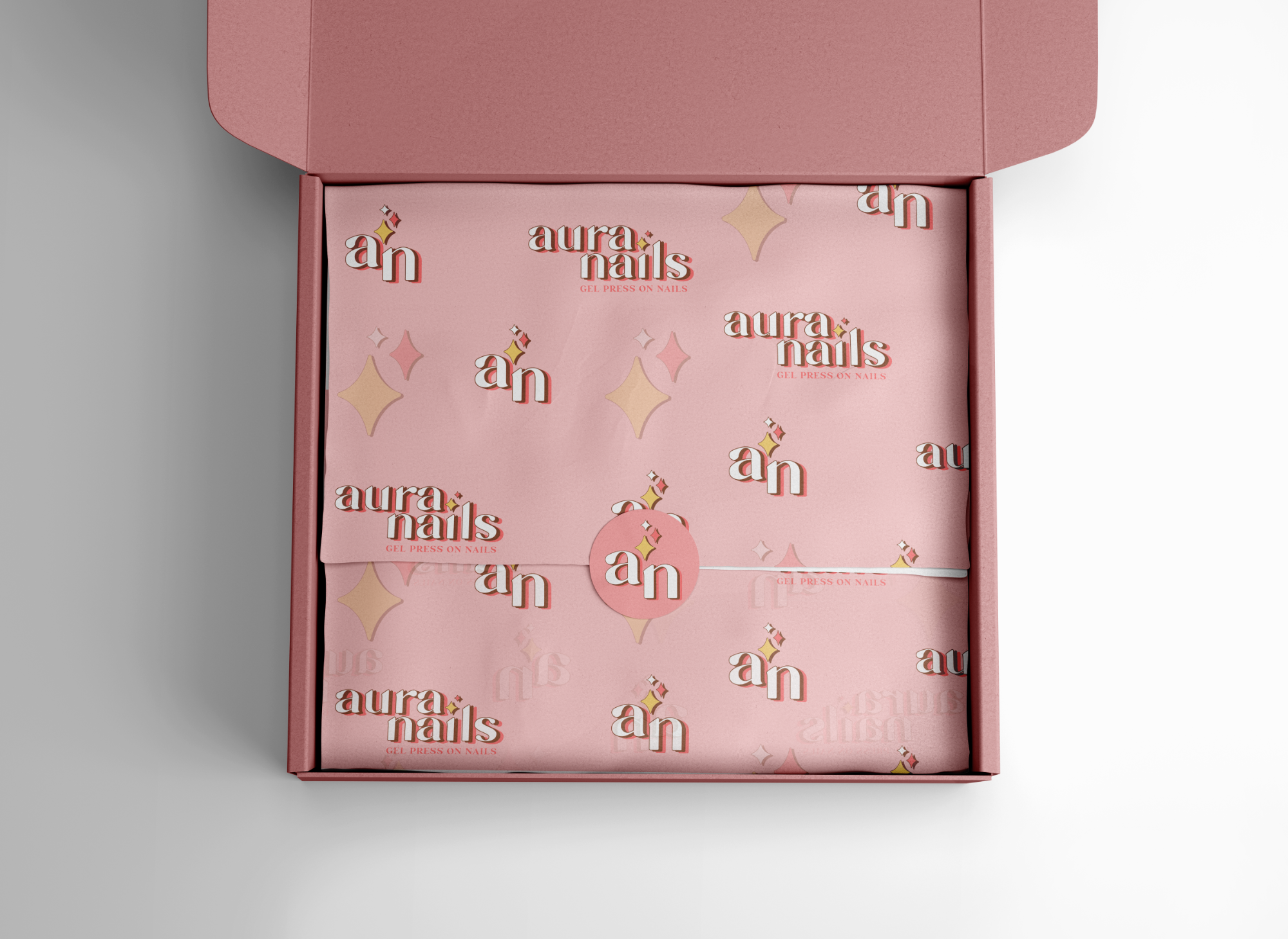 Aura Nails is a self-initiated branding project for a gel press-on nail business. The goal was to create a feminine logo that feels high-end while remaining clean and functional for packaging applications. Designed in Illustrator and refined in Photoshop, the final identity strikes a balance between softness and sophistication—perfect for a modern beauty brand.